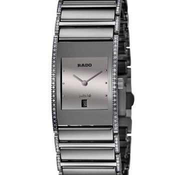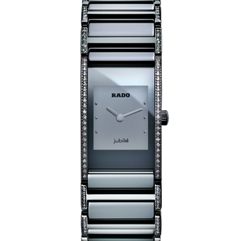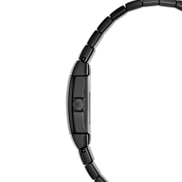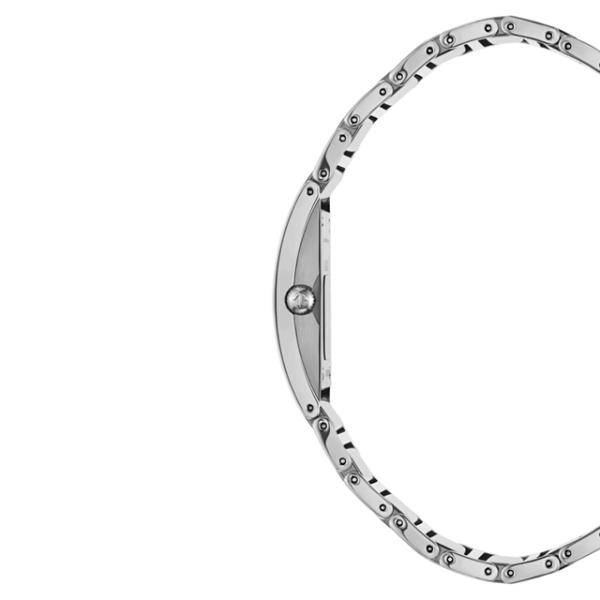 Silver-tone stainless steel case with a silver-tone stainless steel and ceramic bracelet. Fixed,