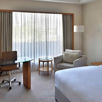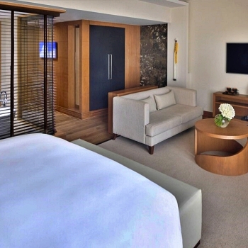 A junior suite situated at corner section of the hotel floor, contemporary designed and decorated