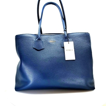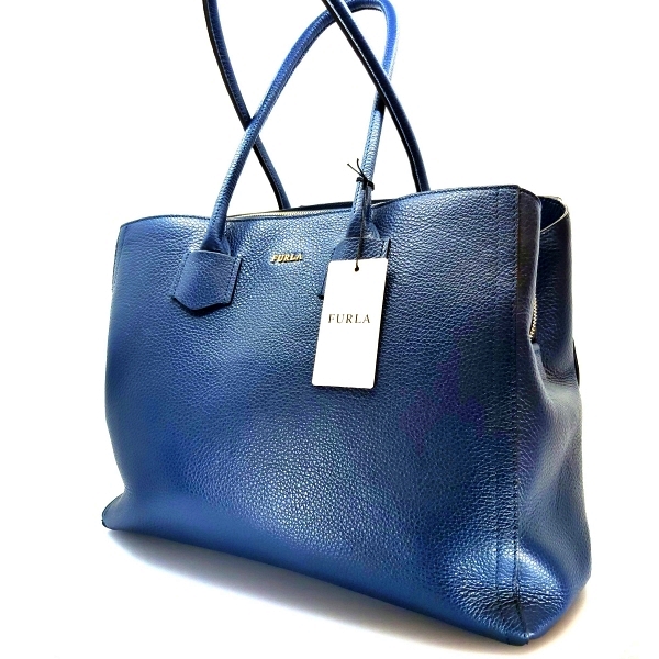 Blue leather Alba handbag from Furla featuring two top handles, gold-tone logo plaque, and one mi