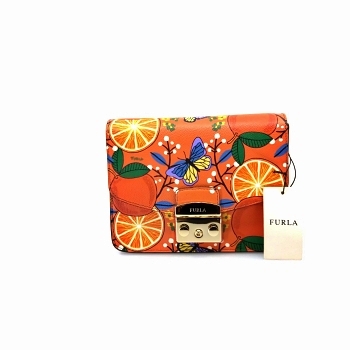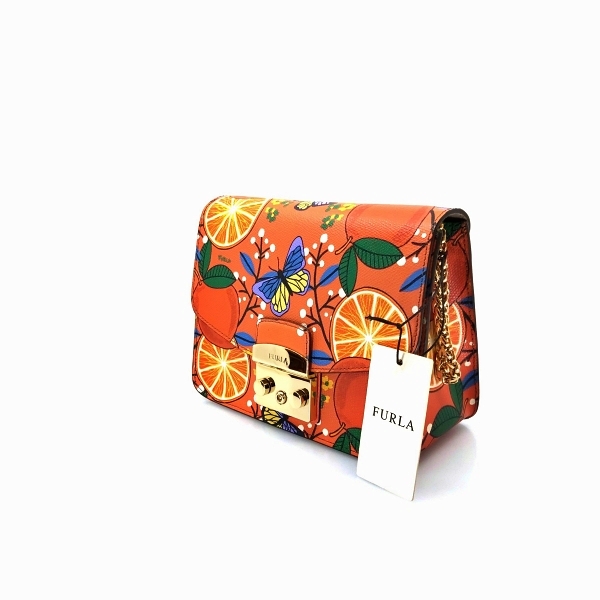 This orange 'Metropolis' shoulder bag from Furla. Made of textured leather. Decorated with colorful print. Decorative closure with engraved logo. Adjustable shoulder strap trimmed with chain. Orange, lined interior with a slip pocket. Gold-tone metal hardware....