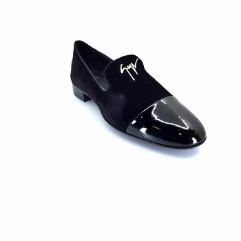 Giuseppe Zanotti men’s black velvet loafers with patent leather toe. Logo Inserted. Made in Ita