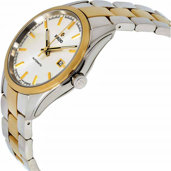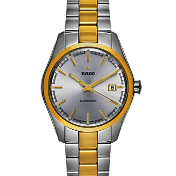 Stainless steel case with a stainless steel bracelet with a yellow gold-plated ceramos center links. Fixed yellow gold-plated ceramos bezel. Silver dial with luminous yellow gold-tone hands and index hour markers. ...