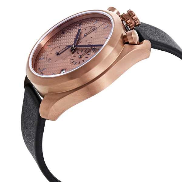 Rose gold PVD stainless steel case with a black leather strap. Fixed rose gold PVD bezel. Rose di
