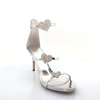 These sky-high heels flaunt a glittering fish skeleton for a dramatic silhouette. Metallic leather and crystal upper. Open toe. Dual adjustable straps. Leather lining and sole....