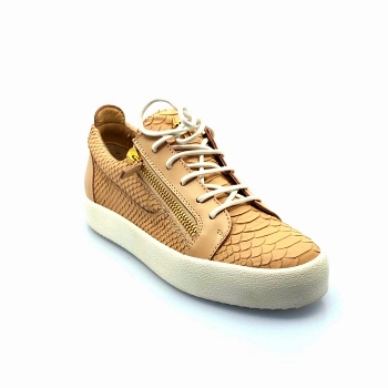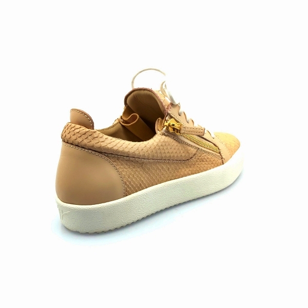 Reptile print leather low top sneakers featuring smooth leather inserts, gold-tone metal zip and signature on tongue, shark tooth rubber sole....