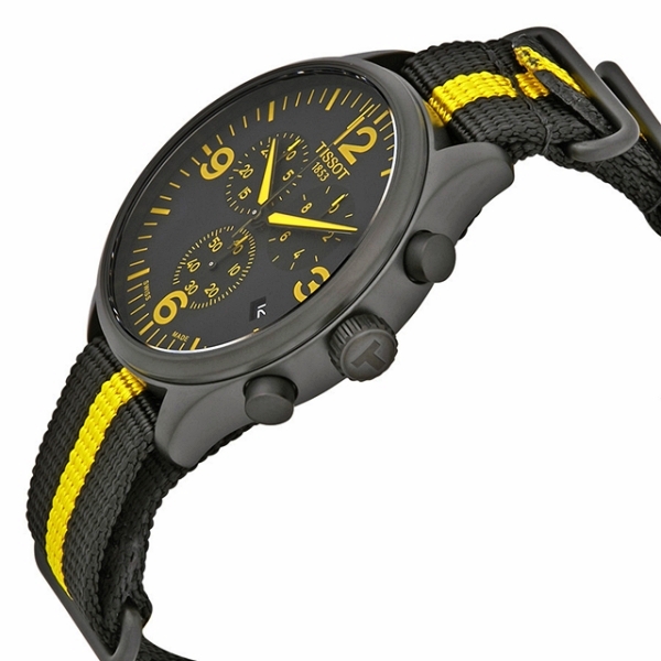 Black PVD stainless steel case with a black and yellow fabric strap. Fixed black PVD stainless steel bezel. Black dial with luminous black hands and index hour markers....