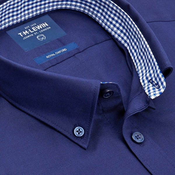 The Royal Oxford casual shirt is in a dark navy shade with a subtly lustrous appearance. This plain shirt has been trimmed with a tonal navy gingham on the internal collar and cuffs for extra detail, especially when worn without a tie. Woven using a two-ply ya...